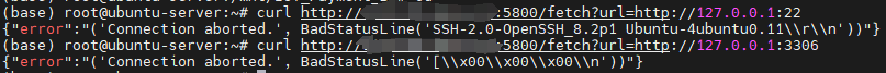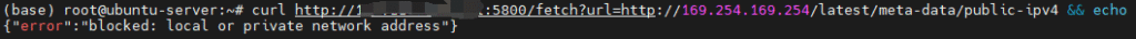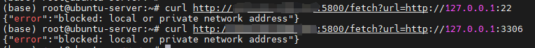 我们运行上述python服务端的实验环境是华为云ECS实例,并在服务器内部部署了数据库等服务。我们通过屏蔽127.0.0.0/8、10.0.0.0/8、192.168.0.0/16、localhost等以禁止用户访问服务器内部资产和内网网段的其它资产。但是这仍然存在SSRF攻击漏洞:
