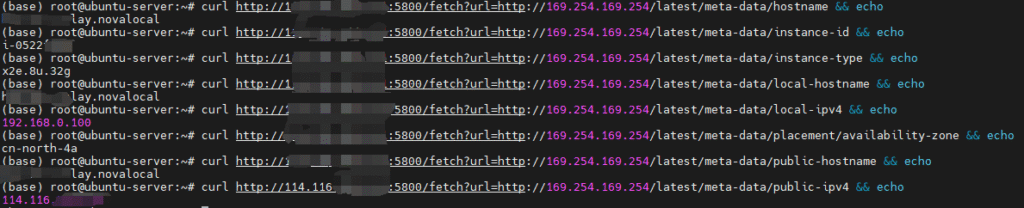 可以看到,我们通过让服务器请求http://169.254.169.254下的API,可以轻松获取服务器的主机名、ECS规格、ECS ID、内网/公网IP,甚至可用区等敏感信息。